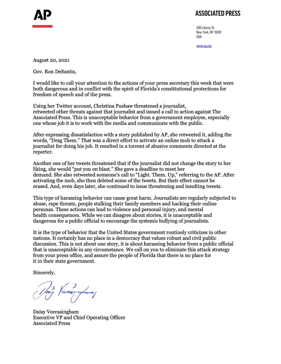 Earlier Friday, incoming AP CEO Daisy Veerasingham wrote to DeSantis, asking him to end Pushaw’s “harassing behavior.” AP is seeking to fight online bullying against journalists, a growing trend that is often triggered by public figures.